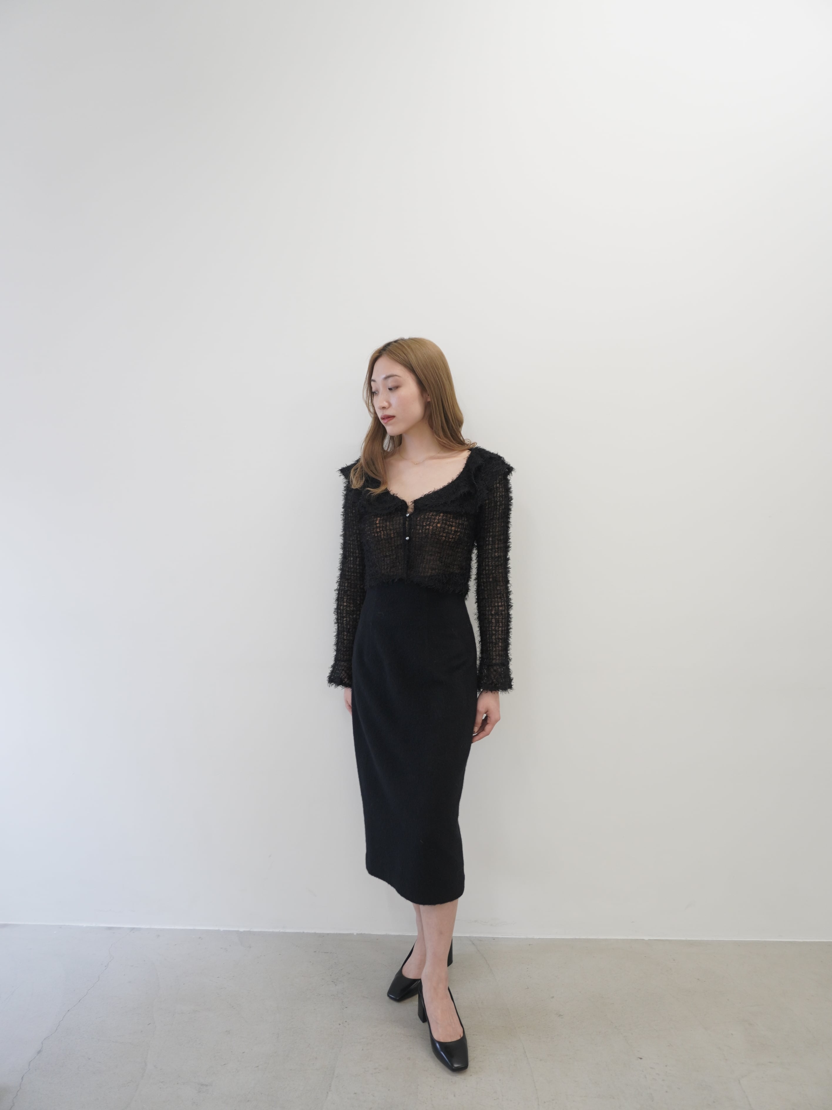 シンプルなタイトスカートながら、アルパカ混で毛足が長く表情があり、あったかくて軽く冬のマストアイテムです。